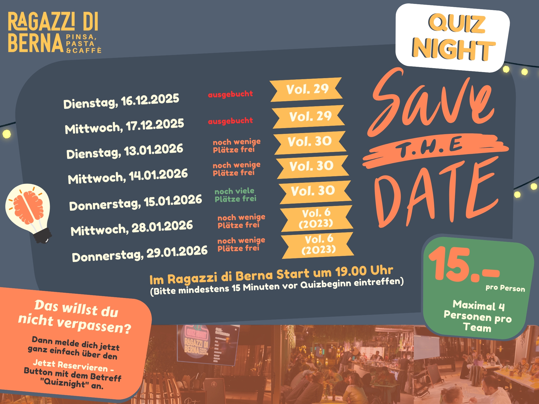 Entfache den Wissensfunken! Genieße einen unterhaltsamen Abend voller Rätsel, Lachen und Gemeinschaft bei unserer Quiz Night im Ragazzi di Berna. Bringe Freunde mit, teste dein Wissen und erlebe, wie dieser Abend zu einem unvergesslichen Highlight wird!